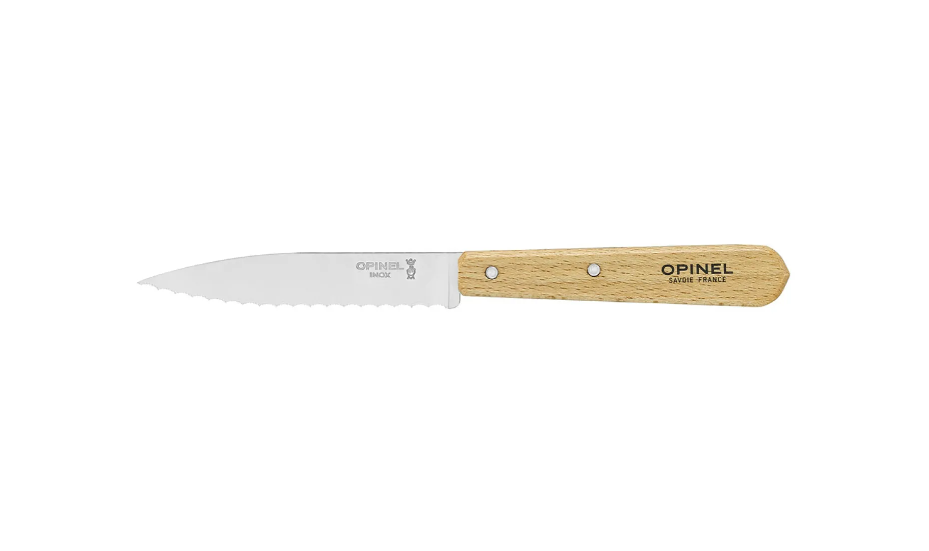 Le hêtre est le bois le plus utilisé pour la fabrication des manches Opinel. Certifié PEFC, il est issu d’exploitations éco-gérées du Jura et du Vercors. Il est dur, résistant et facile à travailler. D’un aspect homogène, sa couleur claire varie du jaune au rosé. Il est reconnaissable par la présence de nombreux petits traits sombres. Le manche est verni pour être mieux protégé contre l’humidité et les salissures.