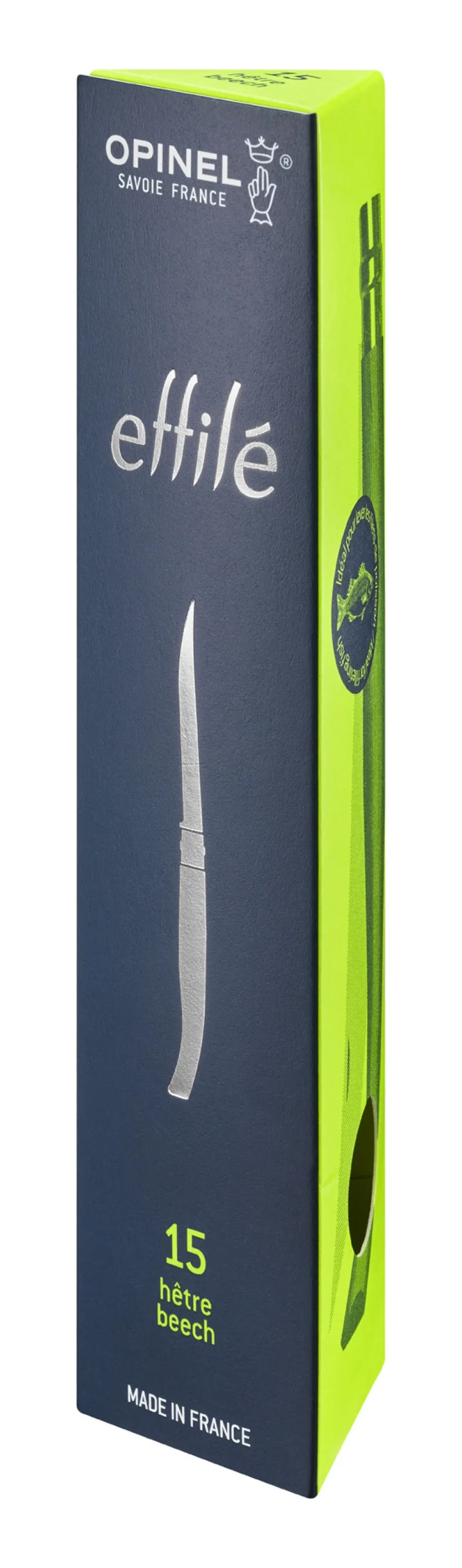 La nouvelle version de l’effilé 15 propose une bague de sécurité Virobloc frappée du nouveau logo des Effilés. Il conserve cependant son design unique : sa lame de 15 cm meulée polie est reconnue, notamment pour lever les filets de poisson, et son manche épuré en bois de hêtre permet une prise en main agréable.
