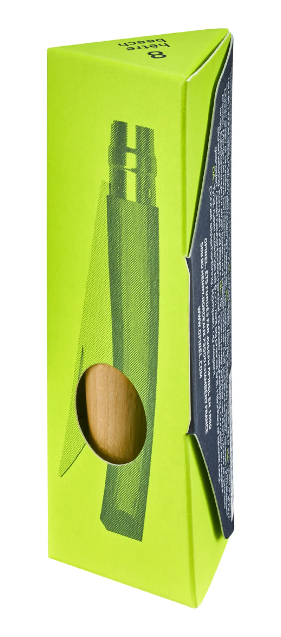 La lame meulée polie fait 8 cm et est en acier inoxydable et le manche est en hêtre, le bois le plus utilisé par Opinel (venant principalement du Jura). La virole de sécurité Virobloc permet de bloquer la lame en position ouverte et fermée.