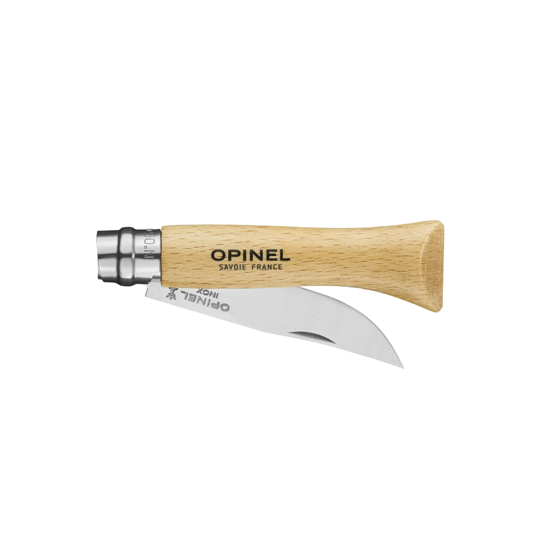 La lame traditionnelle de l’Opinel est dite lame Yatagan. Sa forme est inspirée d’un sabre turc, à la pointe relevée. La lame est meulée selon un profil bombé exclusif qui garantit la robustesse de la lame et permet des réaffûtages performants.