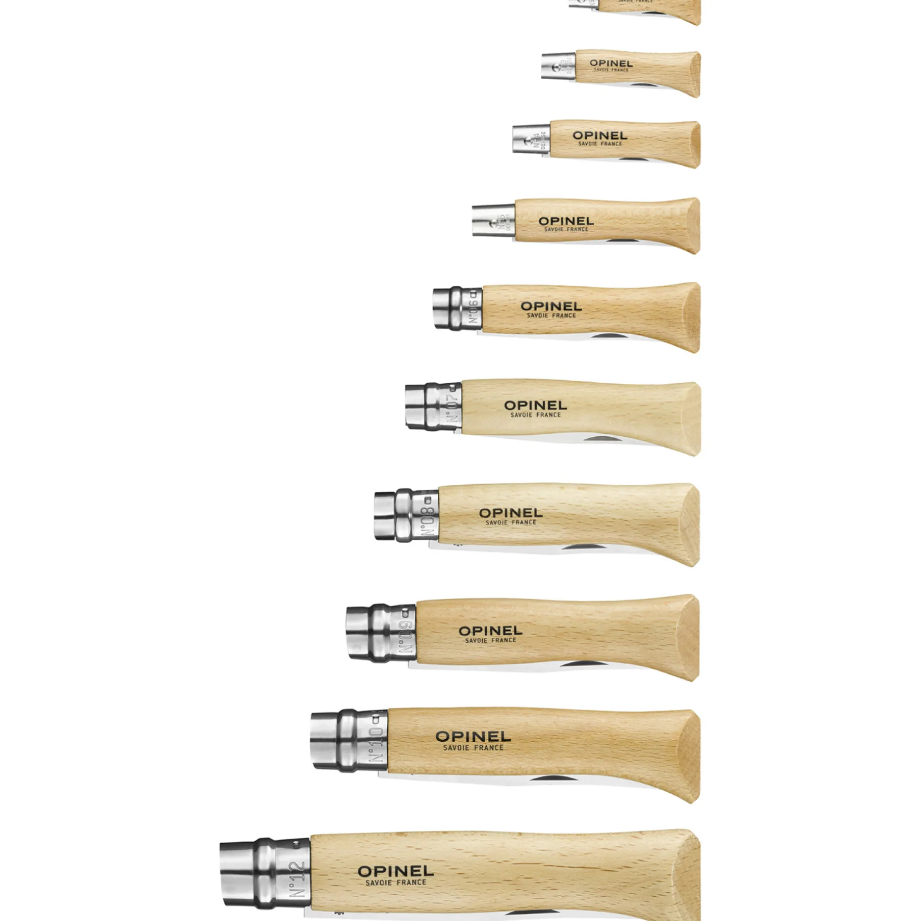 Le hêtre est le bois le plus utilisé pour la fabrication des manches Opinel. Certifié PEFC, il est issu d’exploitations éco-gérées du Jura et du Vercors. Il est dur, résistant et facile à travailler. D’un aspect homogène, sa couleur claire varie du jaune au rosé. Il est reconnaissable par la présence de nombreux petits traits sombres. Le manche est verni pour être mieux protégé contre l’humidité et les salissures.